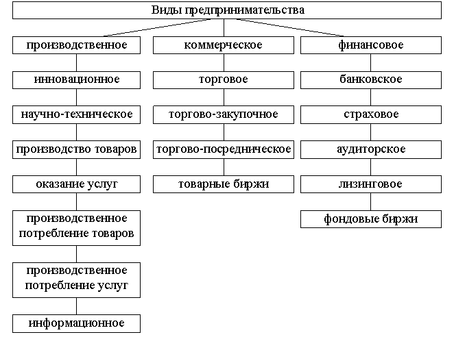 Как видно по схеме, к производственному предпринимательству относятся инновационная, научно-техническая деятельность, непосредственно производство товаров и услуг, производственное их потребление, а также информационная деятельность в этих областях. Любой предприниматель, вознамерившийся заняться производственной деятельностью, прежде всего, должен определить, какие конкретно товары он будет производить, какие виды услуг намерен оказывать. Далее предприниматель приступает к маркетинговой деятельности. Для выявления потребности в товаре, спроса на него он вступает в контакты с потенциальными потребителями, покупателями товаров, с оптовыми или оптово-розничными торговыми организациями. Формальным завершением переговоров может служить контракт, заключенный между предпринимателем и будущими покупателями товаров. Такой контракт позволяет свести к минимуму предпринимательский риск. В противном случае предприниматель начинает производственную деятельность по выпуску товара, имея лишь устную договоренность. В условиях сложившихся рыночных отношений на Западе устная договоренность, как правило, служит надёжной гарантией и в последующем, при необходимости, может быть оформлена в виде контракта, сделки. Значительно сложнее в нашей стране. В условиях лишь формирующихся рыночных отношений надежность устной договоренности очень невелика, а риск существенно высок.