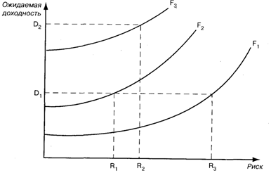 Кривые на карте предпочтений имеют положительный наклон, так как из сопоставляемых критериев один — позитивный, а другой — негативный. Изображенные на рисунке кривые носят название «кривых равных предпочтений» или «кривых безразличия», так как каждая из них отражает своими точками равнопредпочтимые для предпринимателя при данном уровне его удовлетворенности пары ожидаемой эффективности и рискованности решения.