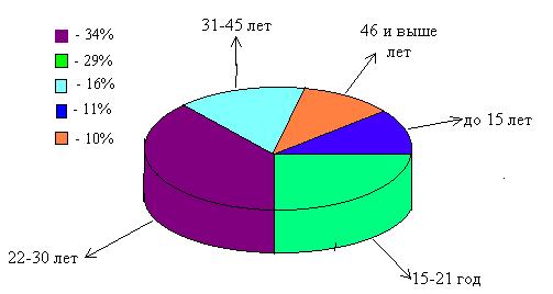 Статистические данные, взятые в ленинской администрации показали примерное население поселка Солнечного. Оно равно 83 тысячам человек, которые составляют потенциальную емкость нашего рынка. На рисунке 4.1. показана сегментация рынка по возрасту. Разбив население поселка на отдельные сегменты по возрасту мы получим количество наиболее потенциальных покупателей.
