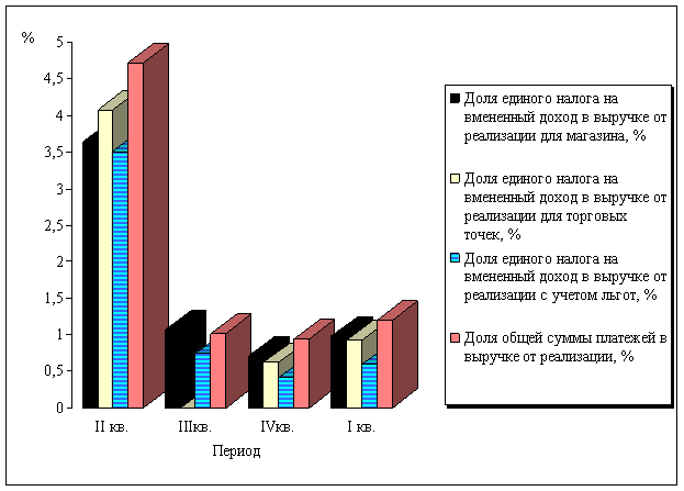 Как видно из рисунка 2, доля единого налога на вмененный доход и доля общей сумме платежей в выручке от реализации во II квартале 2002 года составляла намного больше, чем в период с III квартала 2002 года по I квартал 2003 года. Данная ситуация сложилась в связи с тем, что во II квартале 2002 года индивидуальный предприниматель Танаянц Е.Ш. только начинала свою деятельность на данном сегменте рынка, выручка была относительно небольшой и товар являлся новым для астраханского потребителя.
