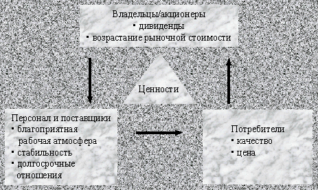 Процветающее предприятие - это предприятие, получающее устойчивую прибыль от своей деятельности. Эта задача-максимум может быть реализована на стабильной основе только через осознание и наиболее полное удовлетворение общественных потребностей или, согласно получившей широкое распространение в международной теории и практике бизнеса концепций, через создание системы ценностей для трех общественных групп: владельцев (акционеров) предприятия, потребителей его продукции, поставщиков и персонала предприятия. Владельцы (акционеры) предприятия, заинтересованы в постоянном и все более возрастающем потоке доходов и таком использовании собственных и привлеченных средств, которое увеличивает ценность принадлежащей им собственности. Персонал и поставщики заинтересованы в стабильности предприятия, в развитии с ним долгосрочных отношений, в благоприятной рабочей атмосфере. Для потребителей наивысшую ценность представляют товары и услуги, удовлетворяющие их по качеству и цене (рис.3).