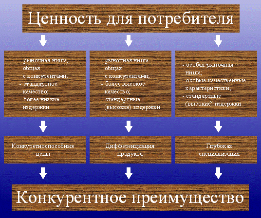 Основной рабочий инструмент в реализации целевой функции предприятия - это его рыночная стратегия, в рамках которой реализуются конкурентные преимущества предприятия. Конкурентное преимущество - это то, что отличает данное конкретное предприятие от его конкурентов и обеспечивает устойчивое положение на рынке. Конкурентные преимущества связаны либо с качественными характеристиками товаров (услуг), либо с более низкими ценами на продукцию предприятия. В международной теории и практике бизнеса различают три основных вида рыночной стратегии предприятия, анализу которых посвятил свои исследования американский экономист Майкл Портер. Для того чтобы успешно осуществлять свою деятельность в условиях рыночной конкуренции, предприятия должны продавать товары или предоставлять услуги либо по более, низкой цене, чем их конкуренты (конкурентно-способные цены), либо с такими качественными характеристиками, которые ставят их вне конкуренции (дифференциация продукта); либо, придав им особые свойства, которые удовлетворяют потребности узкого круга потребителей (глубокая специализация) (рис.2).
