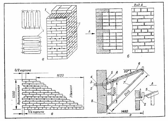 а — армирование столба сетками «зигзаг»; б — многорядная кладка с облицовкой лицевым кирпичом; в — штрабы — вертикальная (слева) и убежная (справа); г — защитный козырек; 1 — сетка «зигзаг»; 2 — крюк; 3 — гайка; 4 — шайба; 5 — опорный угольник; 6 — деревянный настил; 7 — кронштейн; 8 — опорная планка.