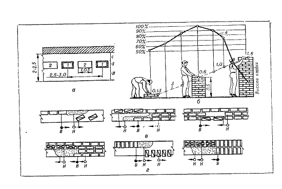 Производительность труда каменщиков в большой мере зависит от высоты уровня кладки. Наибольшей производительности каменщики достигают при укладке кирпича на высоте 0,5—0,6 м от уровня рабочего места (рис. VI.6, б). В начале кладки и с увеличением ее высоты производительность уменьшается. Учитывая это, ярус кладки по высоте принимают при толщине стены до 2,5 кирпича — 1,2 м, а при толщине 3 кирпича — 0,9 м.
