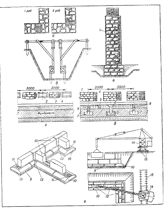 а - бутовая кладка; б - шаблон для бутовой кладки в траншее: в - бутовая кладка с облицовкой кирпичом; г - рабочее место каменщиков при кладке ленточных фундаментов на глубине до 1,25 м; д - то же, на глубине более 1,25 м ,е- элементы подземной части здания (слева) и монтаж фундаментных блоков и стен подвала (справа); 1 - гидроизоляция; 2 - ящик для раствора; 3 - штабеля бута; 4 - щебень; 5 - приставная лестница (стремянка) и лоток для подачи раствора; 7 - щиты для камня; в - желоба для спуска камня; 9 - песчаная подушка, 10 - фундаментные блоки-подушки; ; 11 - армированный пояс; 12 - блоки стен фундаментов: 13 - участки бетонируемые по месту; 14 — кран; 15 — подкрановые пути.