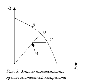 Вернемся к примеру с двумя продуктами и предположим, что граница производственных возможностей построена, а также известен выпуск каждого из продуктов по итогам года. На рис. 5.2 показана точка A, соответствующая производству продукции. Из рисунка видно, что предприятие может увеличить выпуск любого из продуктов, а также всех продуктов одновременно, оказавшись в любой из точек на границе производственных возможностей между B и C. При этом, если предположить, что выпуск продуктов будет осуществляться пропорционально, то предприятие может перейти в точку D. Точка D – это точка, которая соответствует максимальной загрузке производственных мощностей при той же структуре продукции, что и в точке A. Если разделить выпуск любого из продуктов в точке A на выпуск в точке D, то полученное число можно считать долей загрузки производственных мощностей: