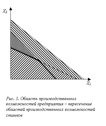 Тогда область производственных возможностей предприятия – это пересечение областей производственных возможностей станков, а граница производственных возможностей предприятия – это граница области производственных возможностей. Действительно, если предприятие может производить объемы продукции, соответствующие некоторой точке в пространстве, то каждый станок имеет возможность эти объемы обработать.