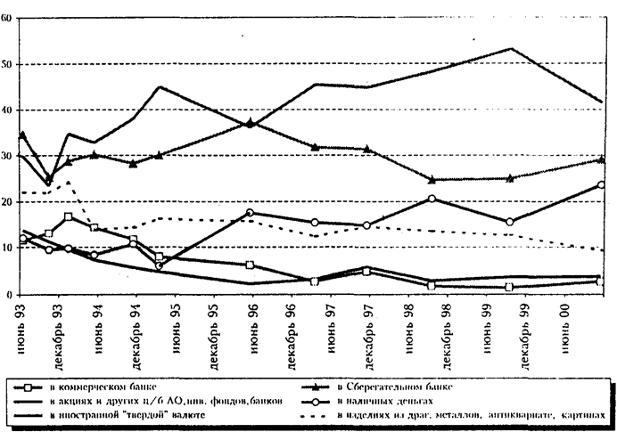 Затем стали появляться новые альтернативные способы вложения денег, а высокие темпы инфляции привели к резкому снижению реальных доходов населения. Старые сбережения обесценились, создавать новые было не на что. В результате к середине 1993 г. лишь ¼ опрошенных отмечала наличие у них каких-либо денежных накоплений. При этом резко упала привлекательность вкладов в Сберегательный банк и, напротив, стала стремительно возрастать популярность таких способов вложения денежных средств, как коммерческие банки, акции предприятий и организаций, иностранная валюта.[11]
