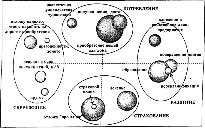 Анализ ответов респондентов с использованием процедур многомерного шкалирования показал, что у населения существуют четыре наиболее распространенные стратегии использования денежных средств. Их условно можно назвать потребление, сбережение, страхование и развитие.