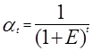 Технически приведение к базисному моменту времени затрат, результатов и эффектов, имеющих место на t-ом шаге расчета реализации проекта, удобно производить путем их умножения на коэффициент дисконтирования άt, определяемый для постоянной нормы дисконта Е как: