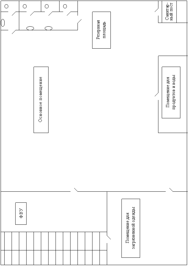 Площадь помещения для продуктов и воды рассчитывается исходя из 5 м2 на каждые 150 человек с прибавлением 3 м2 на каждые последующие 150 человек: