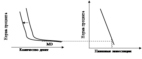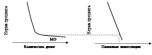 Во-первых, Кейнс полагал, что инвестиции малочувствительны к изменениям процентных ставок. График плановых инвестиций относительно неэластичен. Кроме того, он думал, что в период депрессии процентные ставки, по-видимому, достигают некоего минимального уровня. Ниже которого их падение уже невозможно. Это соответствовало утверждению о том, что кривая спроса на деньги при низких нормах процента станет чрезвычайно эластичной, фактически, почти горизонтальной. Такое парадоксальное положение вещей было названо «ликвидной ловушкой». Объяснение столь необычного термина: склонность людей накапливать ликвидные активы (деньги) будет препятствовать падению процентных ставок, удерживая как в ловушке экономику, так как высокий уровень процентных ставок не способствует увеличению объемов плановых инвестиций.
