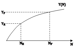 Y(N) – производная функция. На оси ординат откладывается значение равновесного дохода YF, проводится прямая, параллельная оси абцисс, и из точки ее пересечения с кривой Y(N) опускается перпендикуляр к оси абцисс. Уровень занятости, соответствующий доходу YF, равен NF. Величина NENF дает меру безработицы.