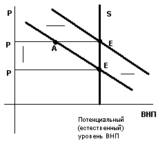 В неоклассической (монетаристской) теории одним из краеугольных является положение о том, что рыночная экономика защищена от спада, что существует определенный механизм саморегулирования, приводящий объем выпуска продукции к уровню, соответствующему полной занятости. Если под воздействием каких-то внешних (экзогенных) факторов (война, неурожай и т. п.) произойдет спад производства, это, по мнению представителей данной школы не будет длиться долго. Почему? Потому что заработная плата, процентная ставка (и вообще все цены) являются гибкими и они вернут экономику в равновесное состояние, когда рабочая сила будет полностью нанята, а все, что произведено,— продано. В этом случае нет никакой необходимости государственного вмешательства в экономику. Поскольку экономика в этом случае постоянно функционирует в режиме полной занятости, то кривая совокупного предложения вертикальна на уровне полной занятости трудовых ресурсов и, следовательно, на уровне потенциального объема ВНП. Падение спроса, например, на труд, переместит кривую совокупного спроса в положение D2. Конечно, вследствие падения совокупного спроса с D1 до D2 появится избыток предложения продукции (его величина измеряется отрезком AE1). Но если принять во внимание возможность быстрого понижения цен на продукцию, а также понижения заработной платы и цен на другие ресурсы, уровень цен будет быстро понижаться с P1 до P2 , пока не наступит равновесие между предложением продукции и спросом на нее в точке E2. Поскольку уровень цен понизится с P1 до P2, реальный объем производства останется на уровне, соответствующем полной занятости. Иначе говоря, снижение совокупного спроса ведет не к снижению объема ВНП и занятости, а лишь к снижению цен. Поэтому вмешательство государства, по мнению экономистов-классиков, в регулирование объемов производства необязательно и нежелательно. Регулирование же совокупного спроса, по их мнению, достаточно стабильного, следует осуществлять в случае необходимости за счет контроля над предложением денег, то есть с помощью монетарной политики.