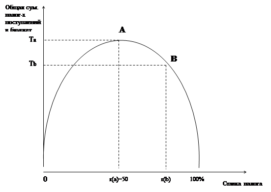 Если ставка налога будет увеличиваться по сравнению с r(a), то произойдет не увеличение, а уменьшение суммы налоговых поступлений в бюджет, т.е. при r(b)>r(a), T(b)<T(a), поскольку при больших ставках налога снижаются стимулы к трудовой и предпринимательской деятельности.