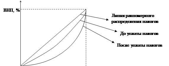 Действующие системы личного подоходного налогообложения несколько сглаживают неравенство в доходах после вычета налогов. График в несколько преувеличенном виде показывает, в какой мере прогрессивные ставки налога могут повлиять на неравенство доходов. Это видно потому, как сужается площадь, отображающая неравенство доходов: прогрессивное налогообложение перемещает сплошную линию влево (до пунктирной линии), ближе к линии равномерного распределения доходов, идущей под углом в 45 градусов.