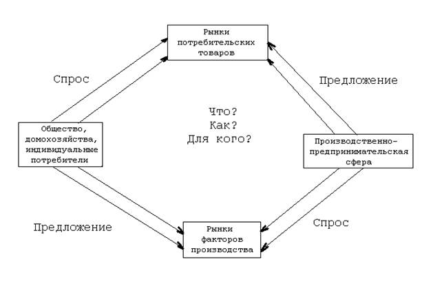 Изучая представленную схему, важно понять, как взаимодействуют рынки потребительских товаров (они в верхнем секторе) с рынками факторов производства (в нижнем секторе). Схема лишь в наиболее общем виде показывает направления взаимосвязей, обусловленных предложением и спросом. В рыночной экономике нет структур, которые занимали бы место между производственной сферой и потребителями, диктуя им, что и как производить и для кого предназначено произведенное. Рынок непосредственно соединяет производителей и потребителей, которые с помощью цен, прибылей или убытков решают важнейшие для экономики проблемы: что, как и для кого производить.