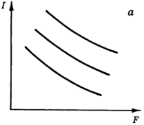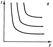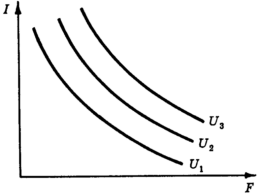 На рис. 1 изображена карта кривых безразличия для дохода и досуга. По оси ординат отложена величина ежедневного дохода (I), по оси абсцисс - величина досуга (F). Чем дальше находится кривая безразличия от начала координат, тем больший уровень полезности ей соответствует. На рис. 1 показаны только три из бесконечного множества кривых безразличия.