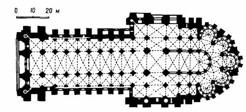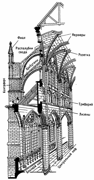 его художественный строй, сочетавший торжественное величие со страстной динамикой, изобилие пластических мотивов со строгой иерархической системой их соподчинения, выражал не только идеи средневековой общественной иерархии и власти божественных сил над человеком, но и растущее самосознание горожан, каркас из столбов (в зрелой Готике - пучка колонн) и опирающихся на них стрельчатых арок. Структура здания складывается из прямоугольных ячеек (травей), ограниченных 4 столбами и 4 арками,