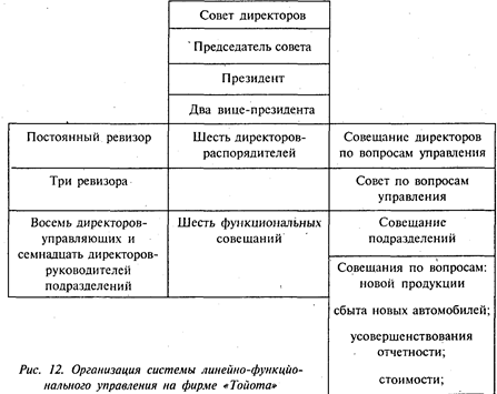 Эти недостатки в определенной мере могут быть устранены при линейно-функциональной структуре управления, когда управленческие решения разрабатывают высококвалифицированные и опытные специалисты, а распоряжения отдаются по иерархии линейных звеньев. Типичная линейно-функциональная форма управления изображена на рис. 12.