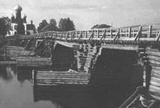 Дерево использовали также для строительства мостов, которые ставили на "городни" - срубы, заполненные камнями и снабженные скосами для отвода льда и твердых предметов. Городни соединяли длинными бревнами - "прогонами", поверх которых уже делали поперечный настил из коротких бревен. Такие же городни применялись и для устройства крепостных стен. Часть стен между городнями-башнями назывались также как и изгородь "прясло". Но были и сплошные двухрядные рубленные стены, заполненные камнем или землей - "тарасы". Сами крепостные башни устраивались в виде срубов, но наверху ставились сторожевые наблюдательные башенки - "вежи". По форме башни были четвериками (в середине стены) или восьмериками (по углам), завершающимися шатрами. До XVI века на Руси слово "башня" не использовали. Их называли "повалушами", "кострами" или "стрельницами".