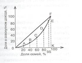 На горизонтальной оси откладывается доля всего количества семей от 0 до 100 %, а на вертикальной оси доли в совокупном доходе. Кривая Рис. 1. ОАВСДЕF показывает фактическое распределение полученного дохода между отдельными группами семей. В нашем примере 20 % всех семей получают самые низкие доходы, и их доля в совокупном доходе составляет около 5 %. 40 % семей получают доход в 15,5 %, 60 % семей – 33 %, 80% – 57 %, 95 % – 84 % и оставшиеся 5 % семей получают 16 % совокупного дохода. Исходя из этого распределения можно сказать, что 80 % семей получают немногим более половины всего совокупного дохода, а 20 % – немногим меньше половины. Это характеризует прежде всего неравномерность распределения дохода. Если бы в распределении доходов существовало абсолютное равенство, то кривая выпрямилась бы и приняла форму FO. Каждая точка кривой соответствовала бы равномерному распределению доходов, т.е. 20% семей получали бы 20 % доходов от всего совокупного дохода общества, 40% населения – соответственно 40% дохода и т.д. Следовательно, линия FOпоказывает абсолютное равенство в распределении доходов.