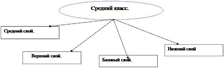С точки зрения социальной стратификации следует говорить не о среднем слое, а о среднем классе, поскольку здесь имеет место процесс классовой кристаллизации, то есть сближения социальных позиций основных социальных групп по таким критериям как власть (на Западе представители среднего класса оказывают весьма существенное влияние на политические процессы) доход, престиж профессии, уровень образования. На основе этих признаков формируется общая идеология, мораль, образ жизни, характеризующее поведение среднего класса. Термин «средний класс» в своем первоначальном значении относится к достаточно большой по численности социальной группе (в промышленно развитых странах она составляет около 60% самодеятельного населения), занимающей серединное положение между двумя крайними полюсами социальной стратификации, которые образуют с одной стороны, политическая элита и наиболее богатые слои населения, а с другой – бедные, деклассированные элементы. Графически этот тип социальной стратификации может быть представлен в форме ромбовидной модели, основной объем которой как раз и занимает средний класс.
