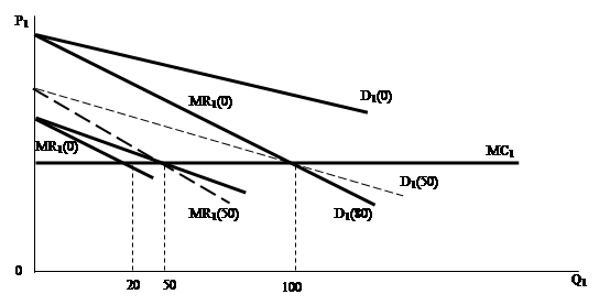 Если фирма А считает, что фирма Б выпускает 50 единиц, тогда кривая спроса фирмы А представляет собой кривую рыночного спроса, смещенную влево на 50 единиц. На рис. 7 это отмечено как D1(50), чему соответствует кривая предельного дохода IR1(50). В этом случае максимизирующий прибыль объем производства фирмы А равен 25 единиц (точка, где IR1(50) = MC1).