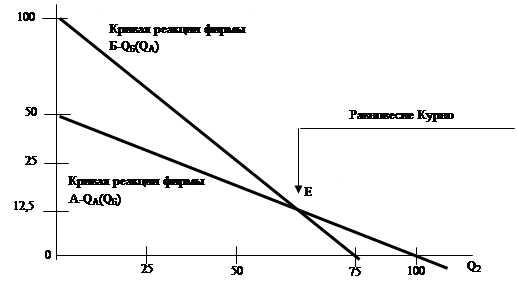 Пересечение кривых реакции этих двух фирм (точка Е) показывает равновесие Курно. При таком равновесии каждая фирма правильно угадвает поведение конкурента и принимает для себя оптимальное решение. В замисимости от этого она может максимизировать прибыль.