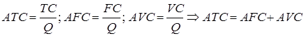 Средние издержки (АТС) - это валовые издержки в пересчете на единицу выпускаемой продукции. Соответственно рассчитываются средние постоянные (AFC) и средние переменные (AVC) издержки:
