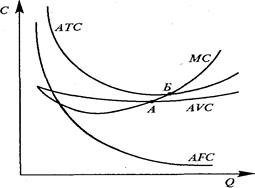 Взаимное расположение кривых на графике всегда подчинено определенным закономерностям. Когда кривая предельных издержек (MC) проходит ниже кривой средних переменных издержек (AVC), последняя всегда имеет характер понижающейся кривой, так как эти издержки сокращаются. С момента пересечения кривых MC и AVC в точке А средние переменные издержки начинают возрастать. Такая же закономерность существует для кривых предельных (MC) и средних валовых издержек (ATC): кривая MC пересекает кривую ATC в точке с их минимальным значением - точка Б.