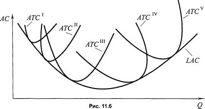 Кривая средних издержек длительного периода, так называемая оберточная кривая, образуется как касательная к множеству краткосрочных кривых средних издержек. Так как эти кривые в соответствии с законом убывающей отдачи поднимаются, то любое увеличение объема производства рано или поздно начнет приносить убытки. Но поскольку эти кривые и издержки, их образующие, связаны с конкретным оборудованием, которое через определенные промежутки времени заменяется более современным, то издержки для каждой новой технологии будут свои: AVCI, AVCII, AVCIII и т. д. Результирующая долгосрочная кривая, проведенная по касательной к множеству краткосрочных кривых и как бы оборачивающая их, будет показывать, как изменяются издержки предприятия в долгосрочный период при разных технологических процессах (рис. 5.4).