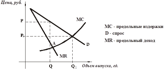 При объеме выпуска Q монополист получит максимальную прибыль. При этом цена будет равна Р (в отличие от чистой конкуренции, где объем был бы равен Q1, а цена составила бы Р1) При наращивание производства предельные издержки начнут превышать предельный доход и прибыль уменьшится.