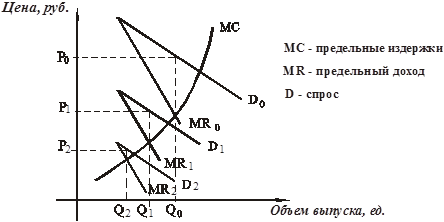 Поскольку рыночный спрос есть величина заданная, расширение производства фирмой Y вызовет сокращение спроса на продукцию фирмы Х. На графике показано, как сместится кривая спроса на продукцию фирмы Х (от D0 к D1,D2). Цена и объем производства, исходя из равенства предельного дохода и предельных издержек, будут снижаться соответственно от Р0 до Р1,Р2 и от Q0 до Q1, Q2.