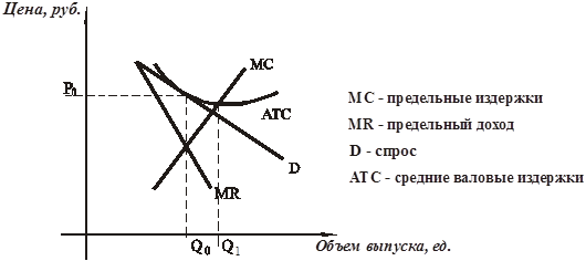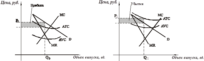 Ситуация во многом сходна с совершенной конкуренцией. Разница состоит в том, что спрос на продукцию фирм не является абсолютно эластичным, и поэтому кривая предельного дохода проходит ниже кривой спроса. Наибольшую прибыль фирма получит при цене Р0 и объеме производства Q0, а минимальные убытки - при цене Р1 и выпуске Q1.