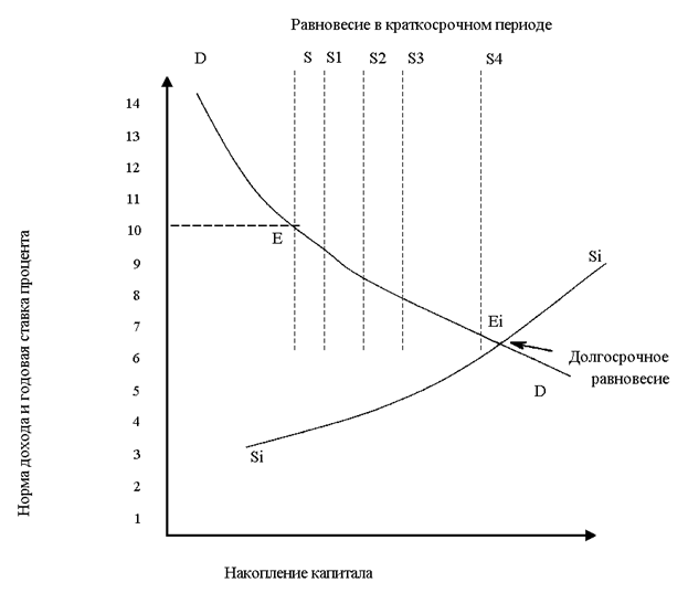 В краткосрочном периоде изменения в функционирующем капитале нереальны. Это показано на графике вертикальными линиями S. В точке Е доход на капитал и процентная ставка в нашем примере равны 10%. При более высокой ставке на рынке появился бы дополнительный капитал и увеличил бы предложение капитала. И, наоборот, при низшей ставке процента нашлись бы компании, которые предъявили бы спрос на капитал. Но равновесие в точке Е кратковременное, так как со временем в результате накопления сбережений вырастает предложение капитала. С ростом предложения капитала от краткосрочного (прямые S1. S2. S3….) предложения мы переходим к кривой SiSi (предложение капитала в долгосрочном периоде). В процессе накопления экономика движется вниз по кривой SiSi. Адекватно этому норма дохода на капитал и ставка процента движутся вниз до точки Ei (равновесие в долговременном периоде). Колебания вокруг точки Ei неизбежны как результат соотношения спроса и предложения. Движение вверх возможно и неизбежно как результат использования достижений научно-технического прогресса в производстве. В современных условиях это не только НТП, но и развитие общественного разделения труда между странами.