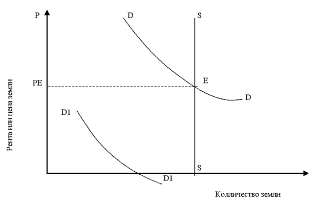 E - равновесная цена земли, установившаяся на уровне РЕ в соответствии со спросом и предложением.