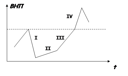 Промышленный цикл и его фазы: I – фаза кризиса; II – фаза депрессии; III – фаза оживления; IV – фаза подъема.