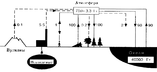 Геологические источники углекислого газа не велики. Например, источник СO2 от вулканической активности и эрозии геологических структур поставляет в атмосферу только 0.1 Гт углерода в год, что гораздо меньше, чем биогенные потоки.