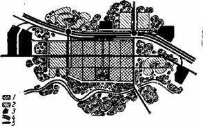 1 – существующий город; 2 – новые жилые районы; 3 – промышленность; 4 – автомобильная дорога; 5 – общегородская магистраль