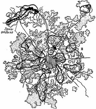 Конфигурация пригородной зоны определяется прежде всего удобствами транспортной связи города с отдельными хозяйствами, использующими территории этой зоны, рациональным размещением в ней отдельных хозяйств, топографией местности и составам земельных угодий. Поэтому пригородную зону нельзя определить в виде круга, механически намечаемого по заданному радиусу.