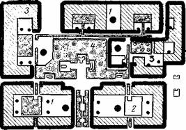 1 – школы и детские учреждения; 2 – районные общественные учреждения; 3 – жилая территория и границы микрорайонов; 4 – сады