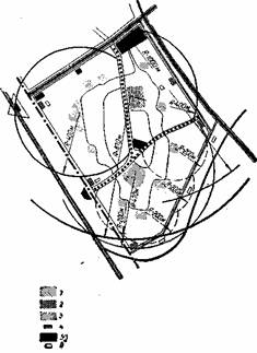 План жилого района в городе 1 – школы; 2 – детские учреждения; 3 – магазины, столовые и предприятия бытового обслуживания; 4 – домоуправление; 5 – гаражи; 6 – кинотеатр; 7 – центр жилого района |