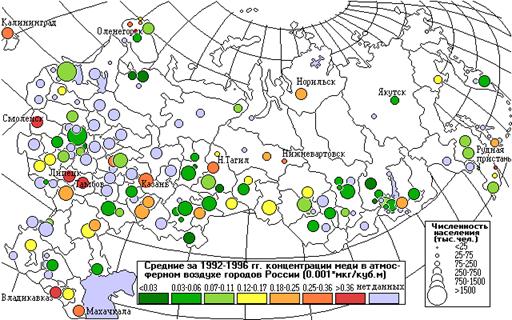 Как видно из карты, самые высокие концентрации меди отмечены в городах Липецк и Рудная Пристань. Повышены также концентрации меди в городах Кольского полуострова, в Заполярном, Мончегорске, Никеле, Оленегорске, а также в Норильске.