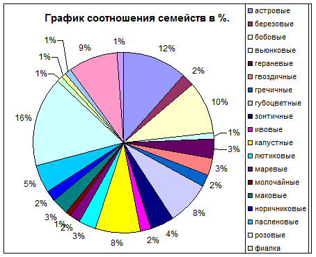Вывод: таким образом, проанализировав видовой состав флоры можно судить о ее разнообразии на территории данной экосистемы. Было встречено 94 вида из 24 семейств, большинство из этих видов являются сорными растениями и приурочены к злаково- разнотравно-кустарниковым сообществам характерным для данной местности. Интродуцированных видов было встречено немного, но несмотря на это их посадки встречаются повсеместно, так как человек их выращивает в собственных интересах, иногда уничтожая для этого местные виды.