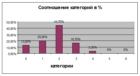 Судя по таблице наиболее преобладает 2 категория деревьев – это деревья средневозрастные с небольшими механическими повреждениями коры и малочисленными сухими ветвями. 5 и 6 категорий нет, поэтому можно сказать о хорошем состоянии древесной растительности на данной территории. Причиной этому может служить не только сниженное антропогенное воздействие в центре экосистемы, но и уход за деревьями (спиливание сухих сучьев, уборка мусора).Соотношение категорий деревьев на этой территории можно изобразить в виде графика: Рис. 3