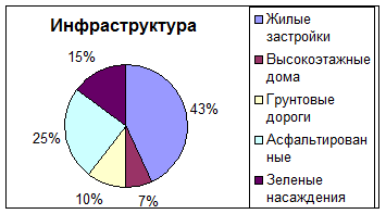 Жилые застройки Высокоэтажные дома Грунтовые дороги Асфальтированные Зеленые насаждения и газоны | 43 7 10 25 15 | 27,95 4,6 6,5 16,3 9,75 |