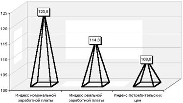 Индексы номинальной, реальной заработной платы и потребительских цен на товары и услуги в апреле 2001 года по отношению к этому же месяцу 2000 года по области в процентах
