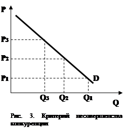 Как и в случае совершенной конкуренции, на несовершенных рынках можно выделить главный критерий, позволяющий относить тот или иной рынок к этой категории. Критерием несовершенной конкуренции является понижение кривой спроса и цен с ростом выпуска продукции фирмы. Часто используется и другая формулировка: критерием несовершенной конкуренции является отрицательный наклон кривой спроса (D) на продукцию фирмы.