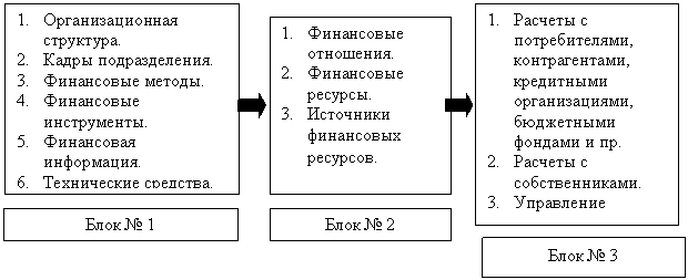 Логика функционирования отдела выглядит следующим образом: информация, поступающая из бухгалтерских отчетов, данные из внешней среды в Блоке № 1 обрабатывается при помощи финансово-экономического анализа, с использованием известных процедур. На основании полученных данных применяются соответствующие механизмы воздействия на переменные в Блоке № 2. Такое воздействие, в свою очередь проявляется в изменении параметров в Блоке № 3. Такая цепочка воздействий повторяется непрерывно на протяжении всего процесса управлению финансовой деятельностью.